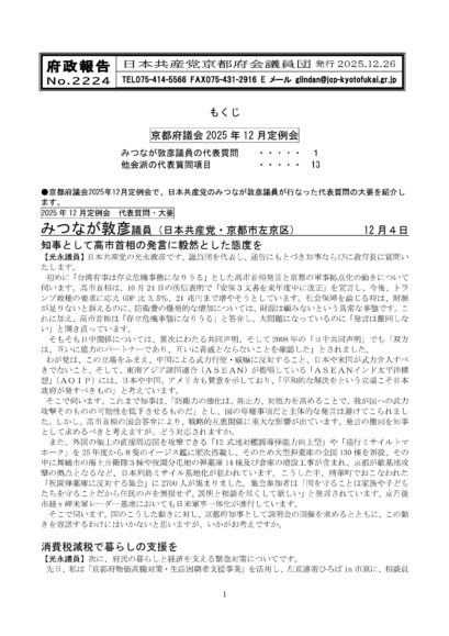 日本共産党京都府会議員団は、12月17日に閉会した京都府議会定例会について、団長談話を発表しましたので、以下全文を紹介します。 2025年12月26日2025年12月定例議会を終えて日本共産…
