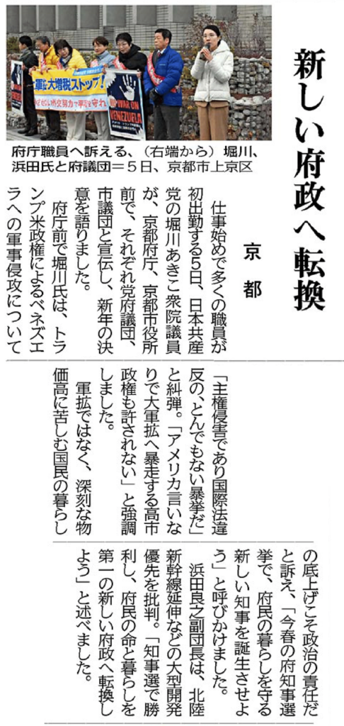 日本共産党京都府会議員団(島田けい子団長、9人)は5日、京都府庁前で初出宣伝を行い、堀川あきこ衆議院議員をはじめ、各議員が訴えました。