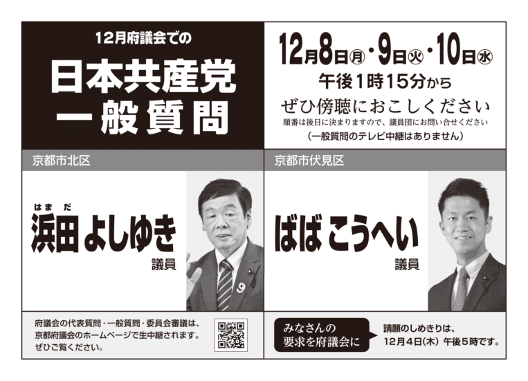 9月11日から京都府議会9月定例会が開会しました。代表質問 9月17日(水)、18日(木)党議員団を代表して、島田けい子議員【京都市右京区】が質問に立ちます。9月17日(水)の2番目(午後2時頃から)…