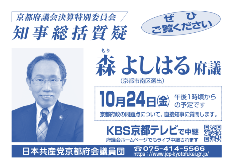 6月11日から京都府議会6月定例会が開会します。代表質問 6月16日(月)、17日(火)党議員団を代表して、浜田よしゆき議員【京都市・北区】が質問に立ちます。6月16日(月)の3番目(午後3時過ぎ)か…